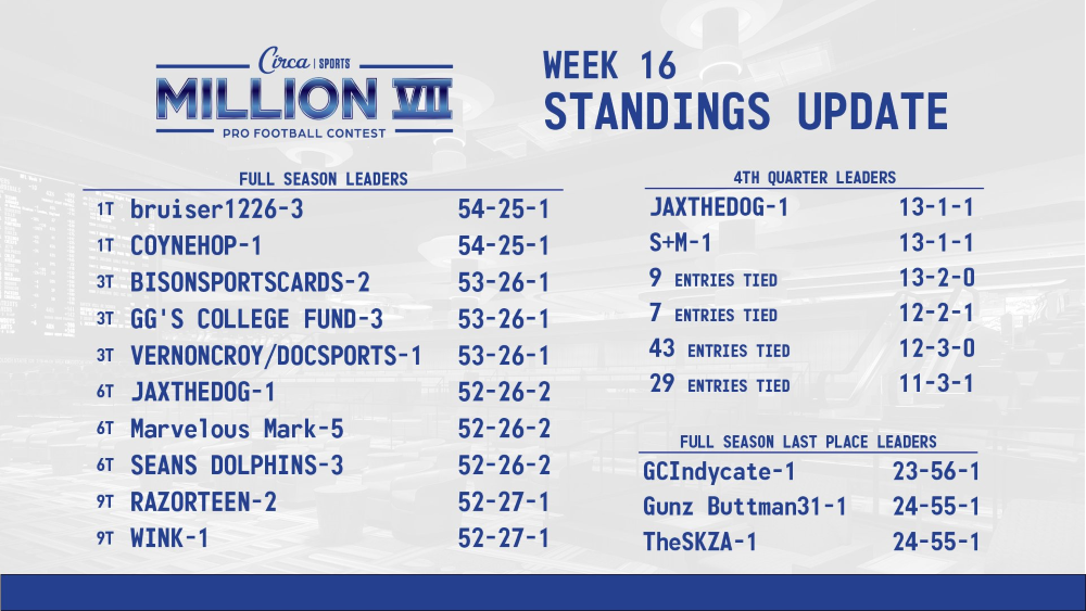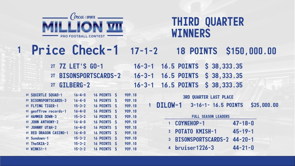 Finally, one entrant picked the New York Giants to win, who were 12-point underdogs at Miami. Methinks the 2 tickets that didn’t bother to make a pick had a better shot to advance than picking the woeful Giants.