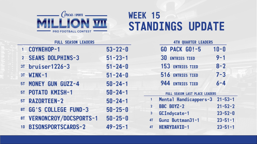 The third-annual Circa Millions drew a bumper field of 4,087 entries to award over $4 million in prizes to several players for their season-long and quarterly finishes. In addition, a $100,000 booby prize was available for the worst record at the end of the season.