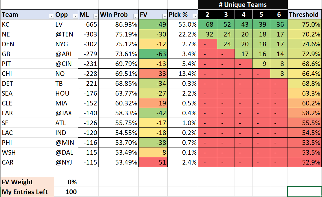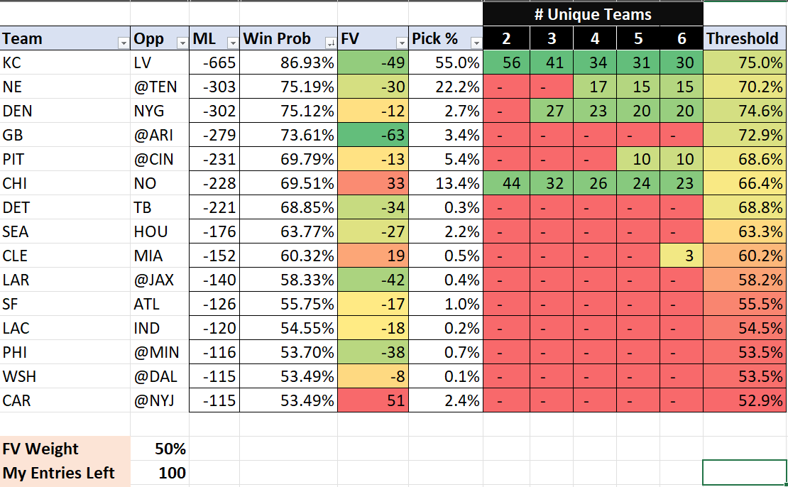 As pools shrink to more moderate sizes the calculus shifts toward balancing immediate win probability with future value (FV). Dialing the spreadsheet’s FV weight to 50% keeps the Kansas City Chiefs as a strong option, thanks to their elite 86.9% win probability against the Raiders.