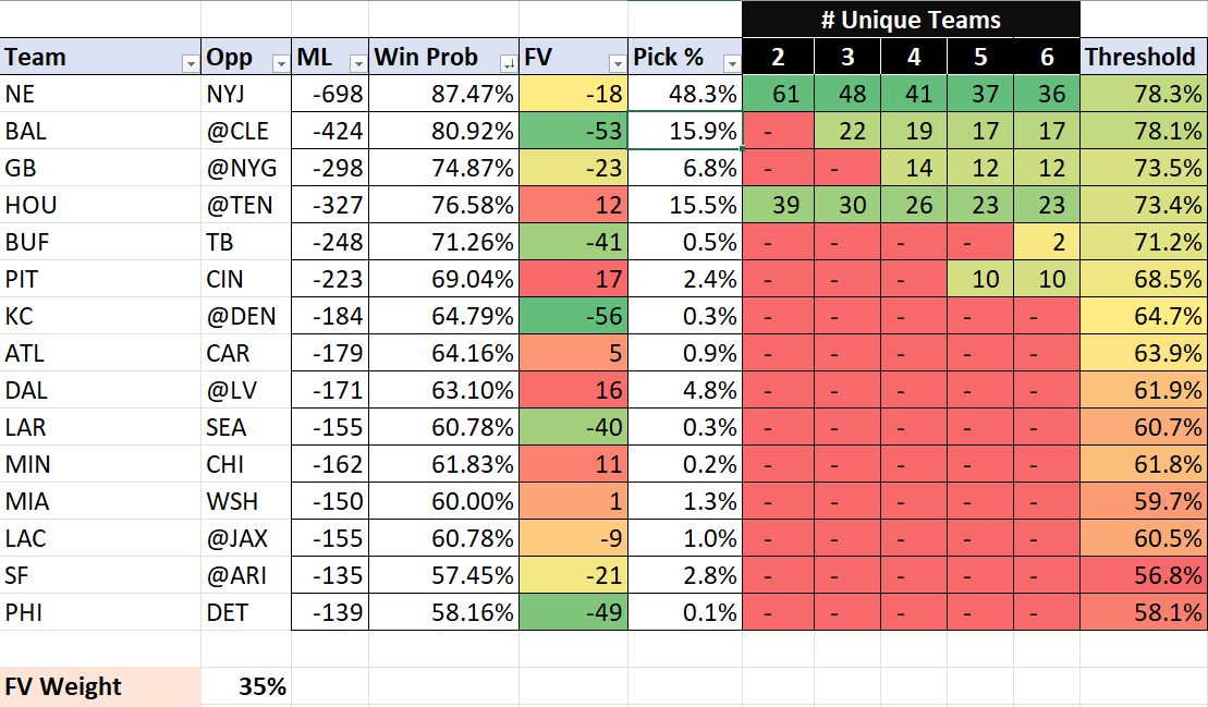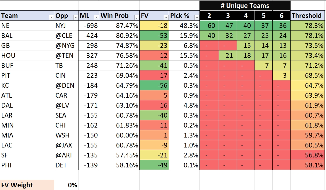 This week, the Patriots are the team garnering the most attention. In small field pools like Grandissimo, five of the six remaining can take New England. If you were one of the six and wondering if it was worth it to fade New England, I have that covered on my spreadsheet in the Threshold column. If you think the four others with New England all take them, then 67% of the field will be on the Pats. When I change the spreadsheet from what Survivorgrid is showing as 48.3% of all entries on New England to 67%, the threshold drops to just under 70%. That means you can fade the Pats with any team over a 70% win probability.