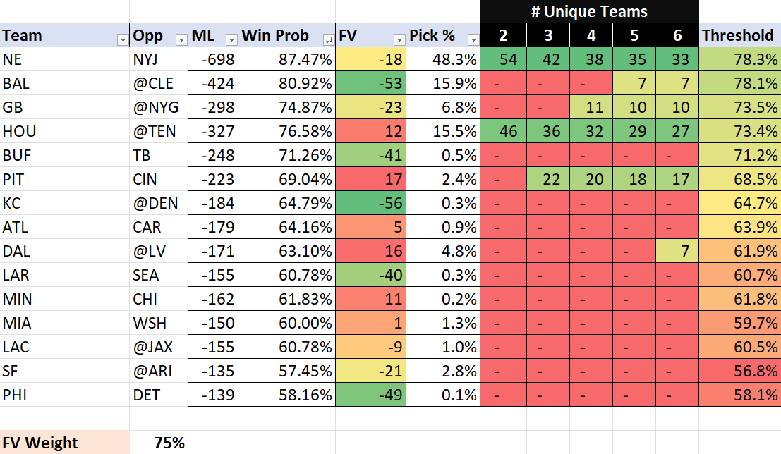 Houston is the second favorite pick on the spreadsheet, weighting FV at 35%. Houston hosts Arizona in Week 15 and Las Vegas in Week 16. If you are pivoting to Houston, you are doing so in hopes of a New England loss, which could double your equity. The fade of New England is not as easy as Carolina last week.