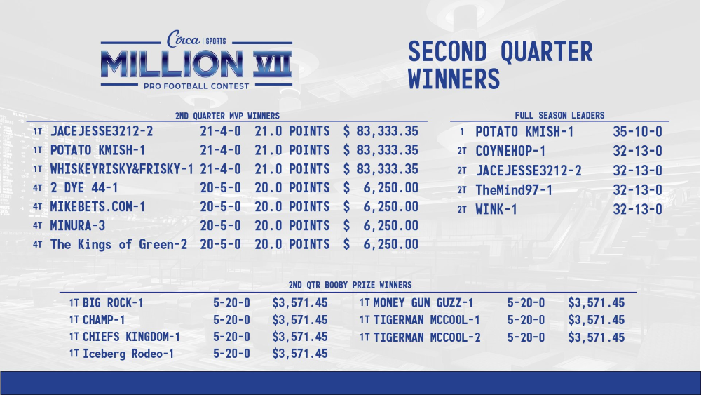 Circa Sports Million Week 9 Standings Update & 2nd Quarter Winners